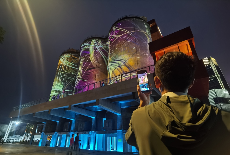 第二届上海国际光影节,位于徐汇西岸的砼仓投影秀“治愈能量罐”,图片右侧有橙红色灯光的建筑是几间新开的餐厅,光影节为其带来源源不断的客流。 陈玺撼摄